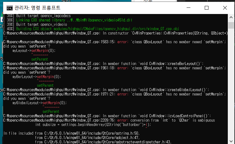 myGlobalLayout->setMargin() 이렇게 더 이상 쓰지 않는 함수 때문에 설치가 멈추면