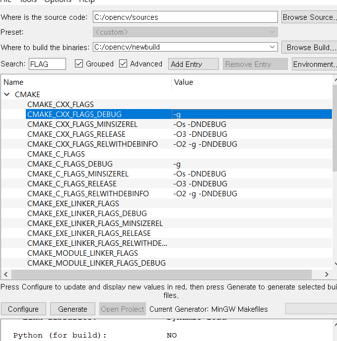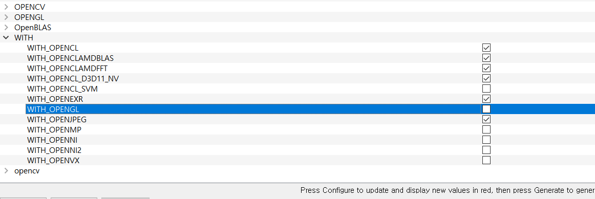 이제 Cmake에서 opencv source에 대해 Configue, Generate가 끝났다면