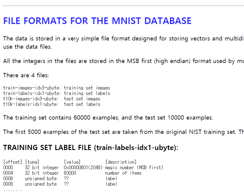 훈련 세트 레이블 파일 (train-labels-idx1-ubyte) :[오프셋] [유형] [값] [설명] 레이블 값은 0-9입니다. |
