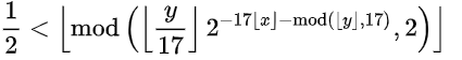 이제 1/2 < floor(mod(floor(y/17)*2^(-17*floor(x)-mod(floor(y),17)),2))